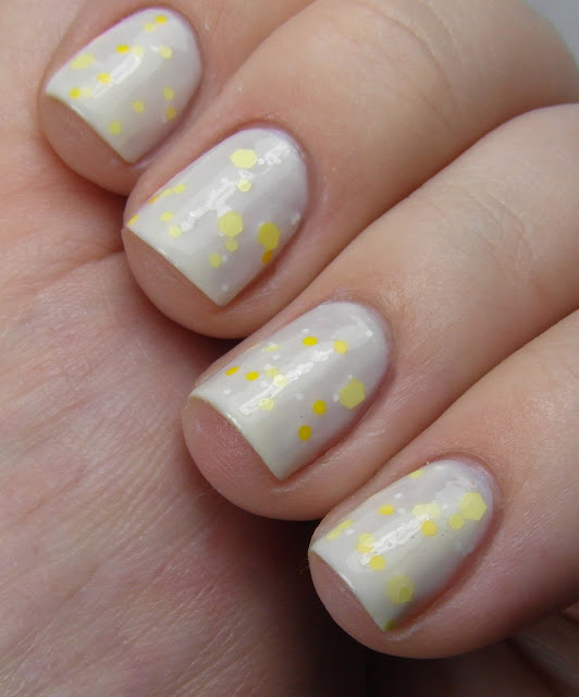 white polish with two shades of yellow matte glitter in multiple sizes.